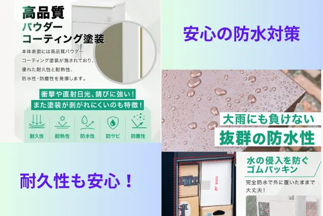 屋外に宅配ボックスを設置するなら、紫外線や雨風に耐え抜く「本物の耐候性」と、浸水を防ぐ「防滴構造・地面からの底上げ」が絶対に欠かせません。