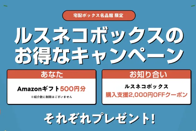 すでにルスネコボックスを利用している方から紹介コードを受け取って新規購入すると、「2,000円引きの購入クーポン」が使えるという大変お得な制度です。
