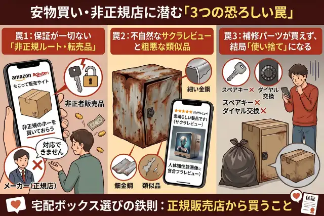 万が一、数ヶ月で鍵が壊れるなどのトラブルが起きても、「当店では対応できません」「メーカーに直接言ってください(メーカーからは正規購入ではないため断られる)」と突き放され、数万円をドブに捨てる結果になってしまいます。