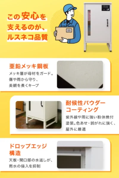 A. ルスネコボックス ONEは、防水構造と高品質なパウダーコーティング(粉体塗装)を採用しています。扉の隙間からの浸水を防ぐ設計により、通常の雨天時であれば中の荷物が濡れることは防ぎやすくなっています。また、防錆性能が高いため、屋外設置でも美観を保ちやすいのが特徴です。